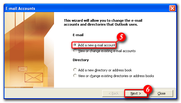 | 5)Place a dot next to 'Add a new e-mail account' |