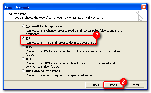 | 7)Place a dot next to 'POP3' |