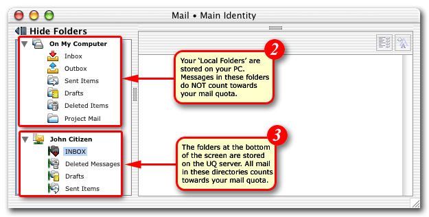 3)The folders at the bottom-left contain all your server-based mail. Messages in these folders contribute to your mail quota. As you have a fixed amount of space on the server it is important to monitor the amount of mail in these directories to ensure your account does not go.'Over Quota'. A go.d rule of thumb is to move any messages that are more than a month old to your local folders group. For assistance transferring mail please read below