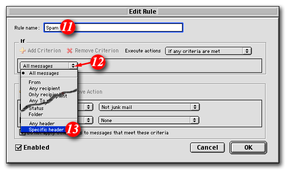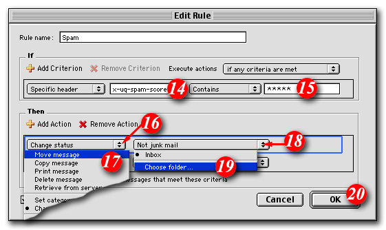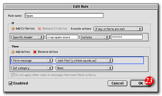 For example, if you wanted to consider anything with a score of 3 or more to be spam, the rule would look like: 'X-SpamDetect: ***'. Decreasing the number of asterisks will result in classifying more e-mails as spam. You may need to check your spam folder more carefully for non-spam e-mails that might have been classified as spam. If you wanted to rate anything with a score of 8 or greater as spam, the rule would look like: 'X-SpamDetect: ********'. Increasing the number of asterisks may result in fewer filtered e-mails being classified as spam and more potential spam staying in your Inbox.