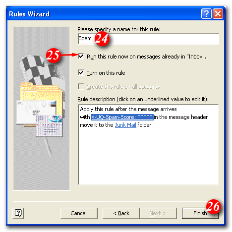 | 25)Put a tick in the 'Run this rule now on messages already in the "Inbox"' checkbox (optional) |
